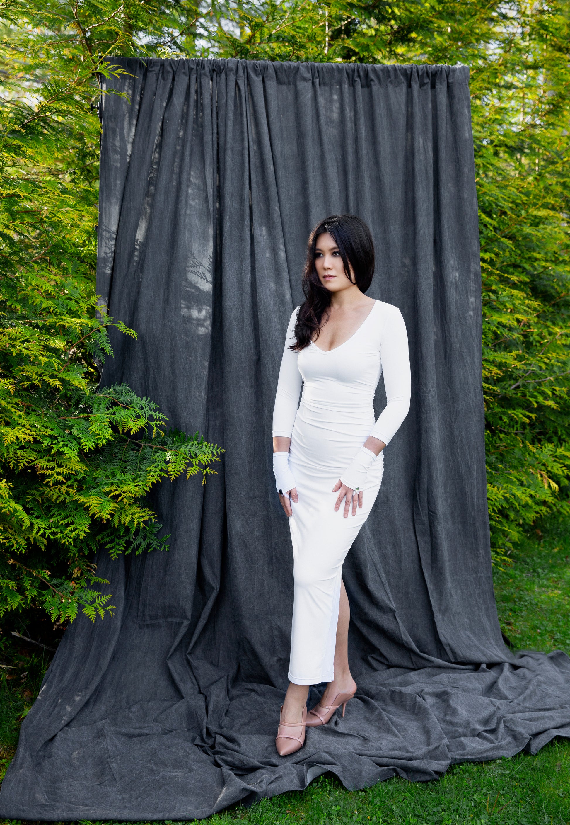 Dress and gloves made of RE-PET recycled plastic bottles 88% + OP 12% + up-cycled ornate jewels + lace from and inspired by Danish Symphony Concert Couture. Size S/M fits small and medium body types. Fabric provides abundant stretch for a fitted look.